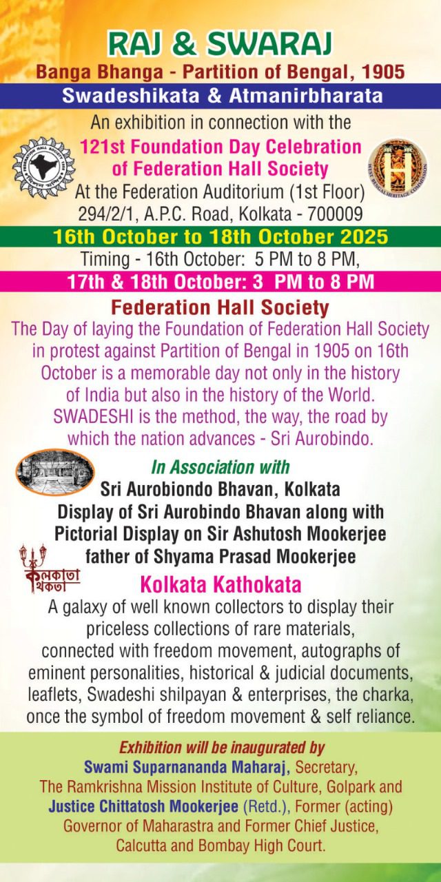 The Day of laying the Foundation of Federation Hall Society in protest against Partition of Bengal in 1905 on 16th October is a memorable day not only in the history of India but also in the history of the World. SWADESHI is the method, the way, the road by which the nation advances – Sri Aurobindo.